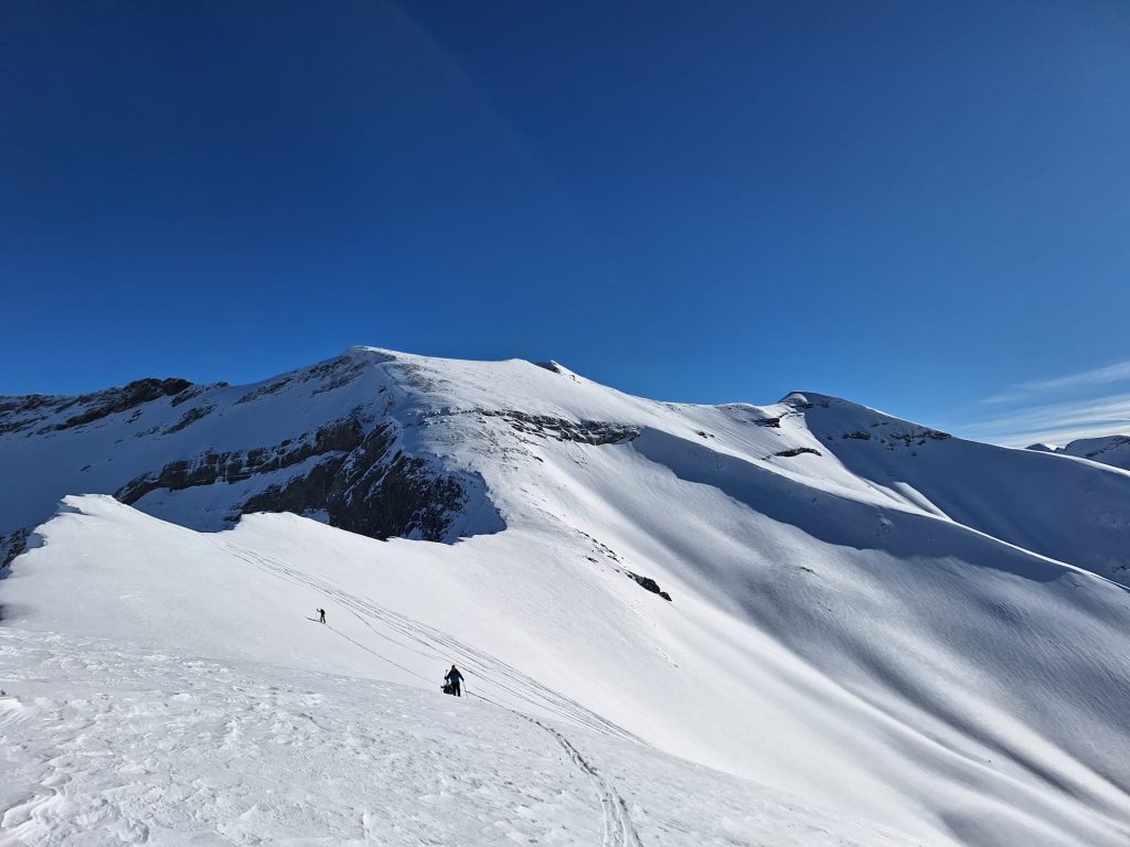 Nous repartons pour une descente qui s’annonce excellente… et ce fut le cas ! Grosse régalade dans cette belle combe nord, qui subit cependant l’attaque de deux hordes de cafistes, qui montent leur camp de base au col du Petit Renaud ! Il est temps pour nous de redescendre dans les prairies pour commencer la pratique.