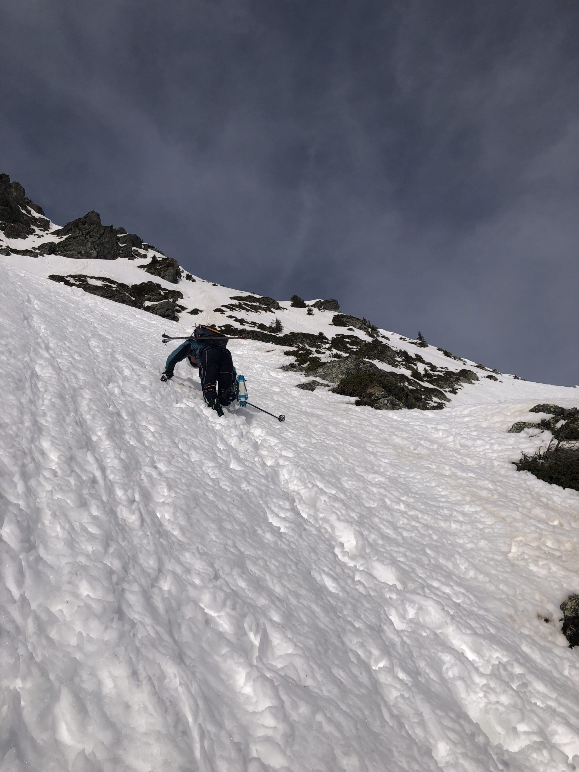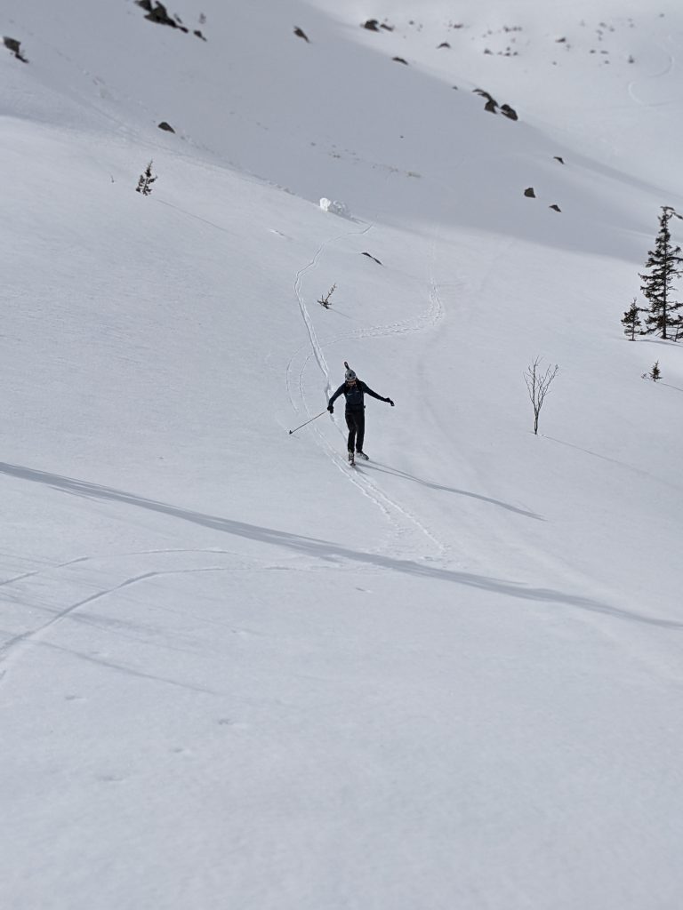 Ariel me suivra avec plus de grâce malgré ses allumettes aux pieds ! Cependant, dans l’ensemble, ça restera un peu laborieux. Surtout que plus nous descendons, plus la neige s’humidifie et s’alourdit, devenant quasiment inskiable. La neige devient très piégeuse, rendant les virages vraiment compliqués.