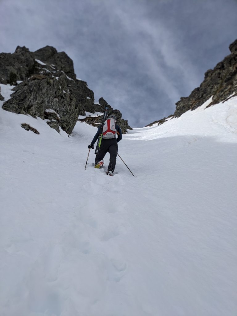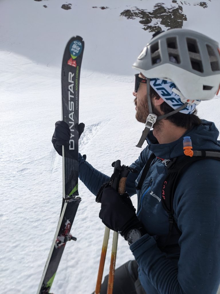 Une fois dedans, il se trouve que la neige transforme très très vite ! Pour la montée, nous réussissons à être plutôt efficace en se relayant (et la face n’est pas très longue), mais ce n’est pas ça qui nous sauvera. La neige devient aussi lourde qu’une blague de Bigard, il va falloir être vigilant à la descente.